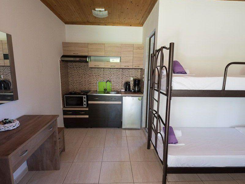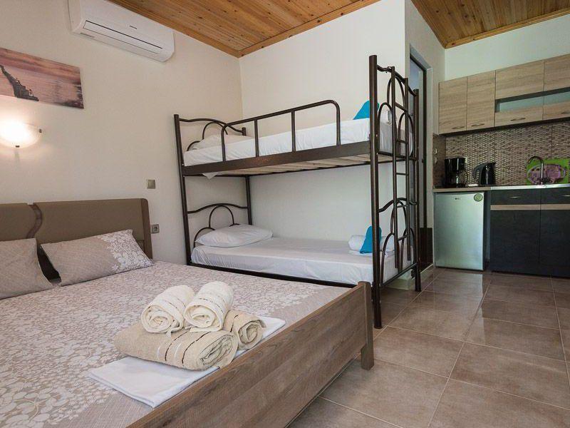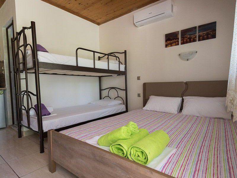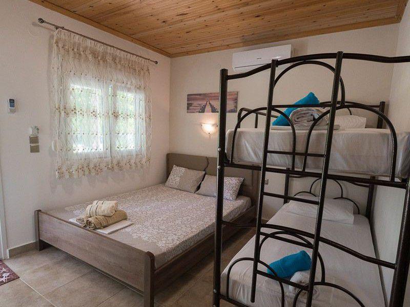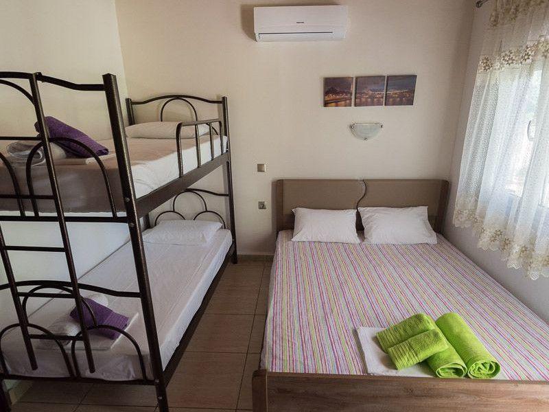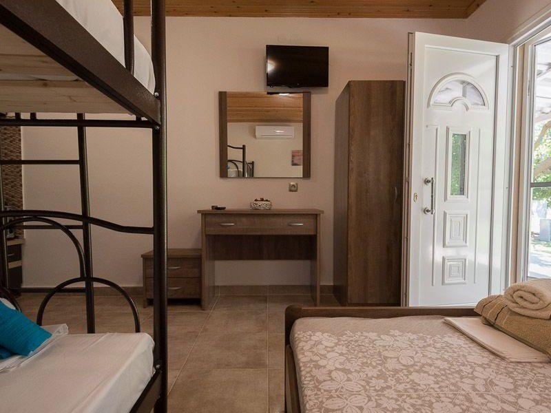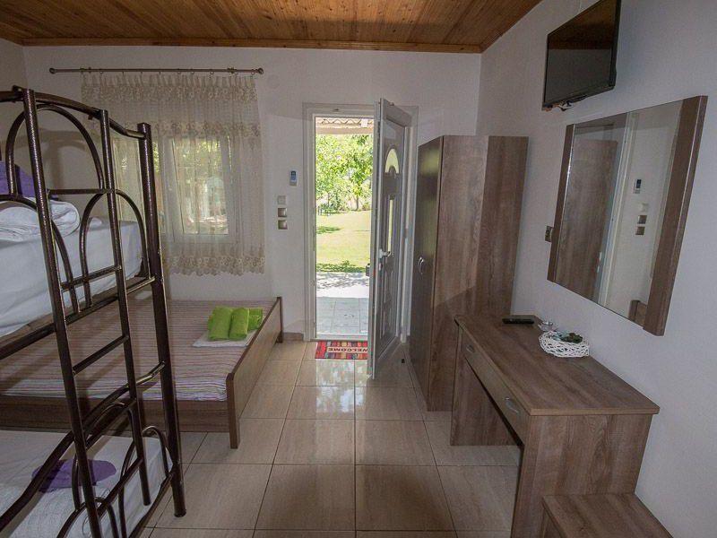 Τα δωμάτια είναι ευρύχωρα με τέσσερα κρεβάτια και έχουν θέα στον κήπο μπροστά από το οικημα.