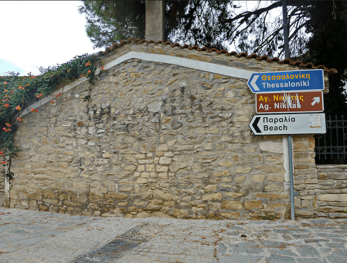Στο σταυροδρόμι του κεντρικού δρόμου, στα φανάρια, στρίβουμε αριστερά για το βουνό.